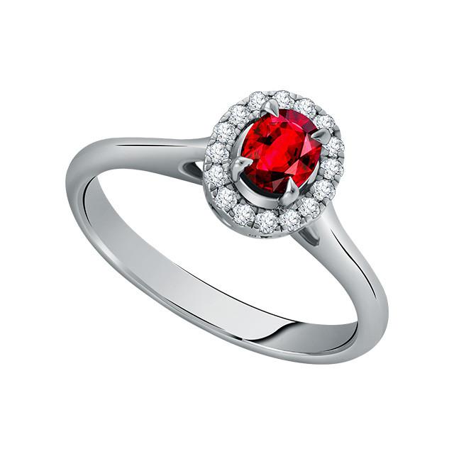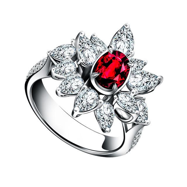 Cincin dengan 1 ruby oval bersertifikat GIA dengan keseluruhan 0,84 carat. Dilengkapi dengan F VVS berlian, dengan total 2,06 carat.