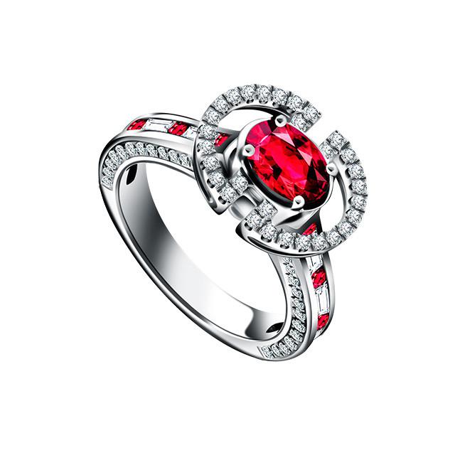 Cincin dengan 8 ruby baguette dengan total 0,138 carat, dan 1 ruby oval bersertifikat GIA dengan total 0,79 carat. Dilengkapi dengan F Berlian VVS, dengan total 0,911 carat.