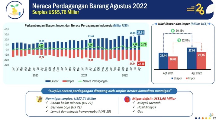 Sebagai catatan, pada Agustus ekspor Indonesia mencapai US$27,9 miliar, rekor tertinggi dan tumbuh 9,1% dibandingkan tahun lalu. Bagusnya ekspor membuat surplus neraca perdagangan mencapai US$5,76 miliar, atau mempertahankan rekor 28 bulan surplus.