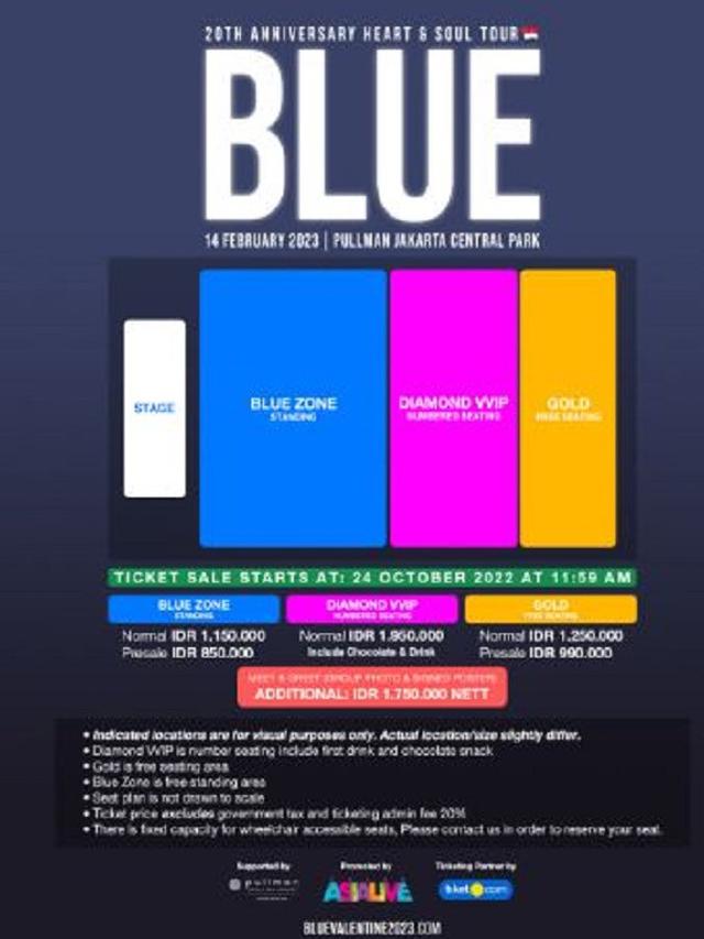 “Blue adalah boyband yang sukses dan membuat banyak penggemarnya terpesona dengan kepiawaian mereka melantunkan lagu-lagu romantis. Karena itulah, Color Asia Live ingin menampilkan kembali Blue ke Indonesia sekaligus bernostalgia dengan tembang-tembang hits Blue dan memeriahkan momen Valentine tahun 2023 nanti,” ungkap David Ananda, Managing Director Color Asia Live, melalui keterangan tertulis, Jumat (21/10/2022).