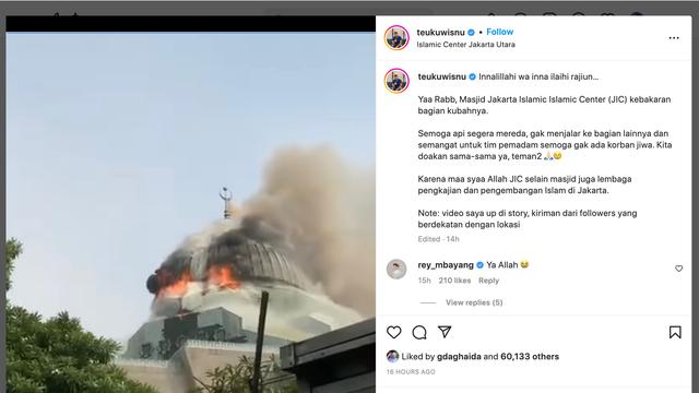 “Innalillahi wa inna ilaihi rajiun. Yaa Rabb, Masjid Jakarta Islamic Islamic Center (JIC) kebakaran bagian kubahnya,” cuit Teuku Wisnu seraya mengajak netizen mendoakan masjid tersebut.