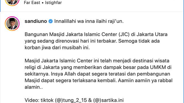 Selain Teuku Wisnu, Menteri Pariwisata dan Ekonomi Kreatif RI, Sandiaga Uni melayangkan dukacita. “Bangunan Masjid Jakarta Islamic Center (JIC) di Jakarta Utara yang sedang direnovasi hari ini terbakar. Semoga tidak ada korban jiwa dari musibah ini,” ungkapnya.
