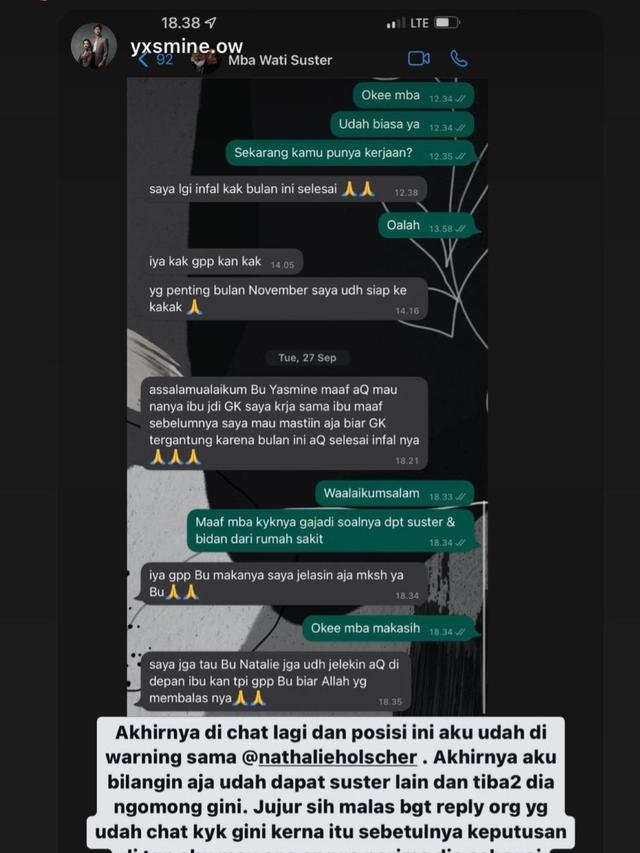 “Sebetulnya Nathalie Holscher enggak ada jelekin Wati ke aku. Dia cuma warning aja biar akunya enggak salah pilih suster. Ini apalagi untuk jagain anak ya sudah pasti aku mau yang terbaik. Dari dulu sudah enggak mau lagi ART yang terlalu aktif di social media,” tulis Yasmine Ow.