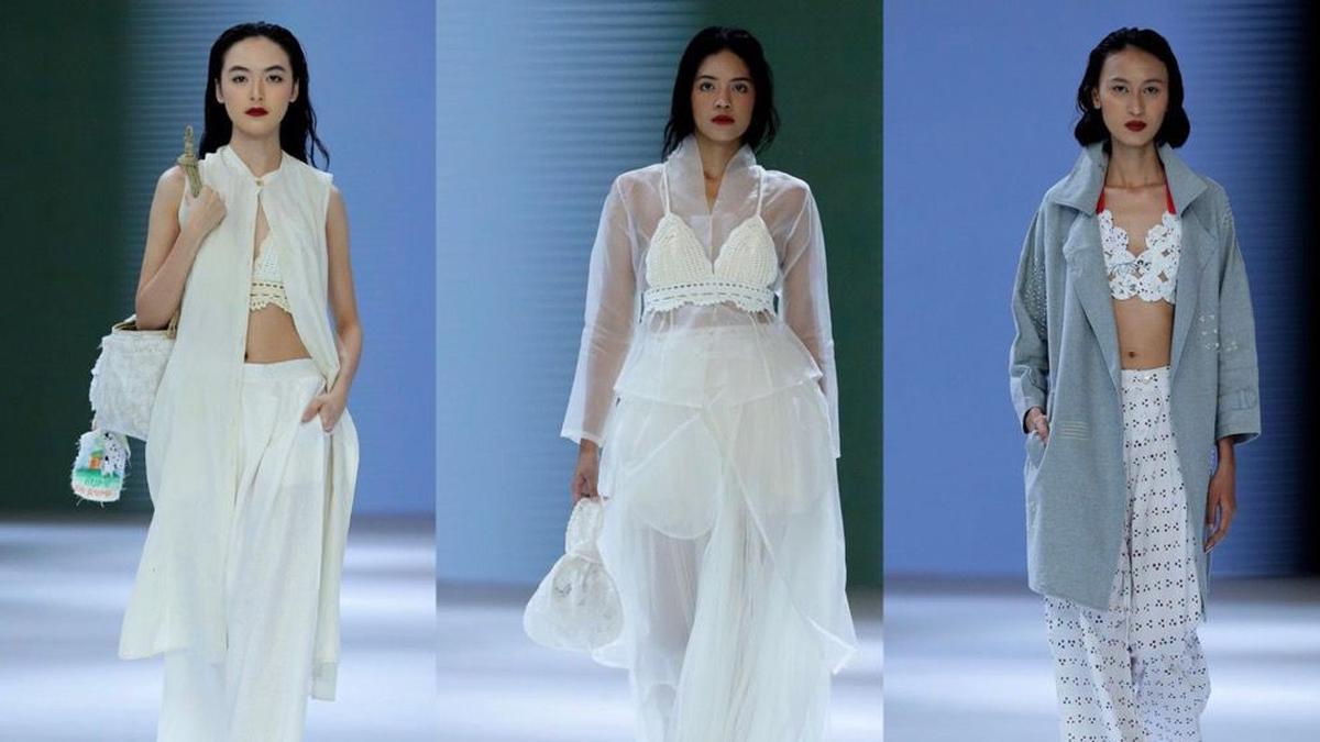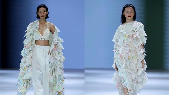 Sebagian besar hadir dalam nuansa putih dan abu-abu. Meski begitu, potongannya jauh dari kesan monoton karena menghadirkan siluet yang lebih berani dan terkesan dramatis untuk material daur ulang tersebut. Salah satunya hadir dalam jaket-jaket statement bergaya avant-garde yang seolah terbuat dari lipatan kertas origami.