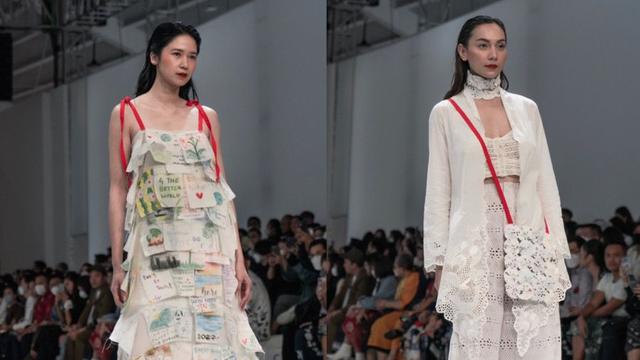 Koleksi dari produk daur ulang ini pun tak bisa dipandang sebelah mata. Tiap potongan tetap terasa cantik di mata pemakainya yang dipresentasikan para model di catwalk JFW 2023. Salah satunya yang dikenakan artis Laura Basuki. Ia hadir dalam potongan gaun bertali yang menampilkan detail kain-kain perca itu yang berpadu harmonis. Secara kasat mata terlihat model layering yang tak biasa.