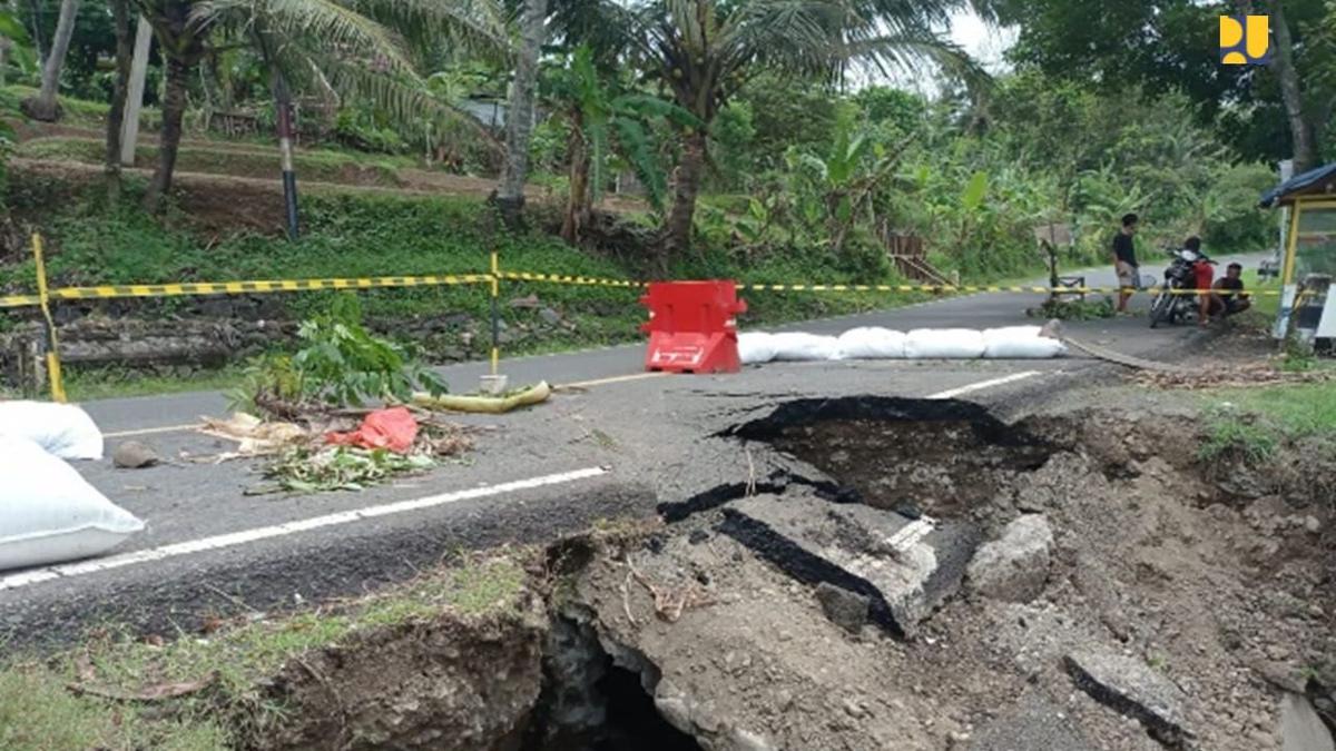 Penanganan sementara telah dilaksanakan dengan pemasangan rambu, garis pembatas/safety line, pemasangan sandbag, dan petugas flagman dan K3 untuk buka tutup arus.