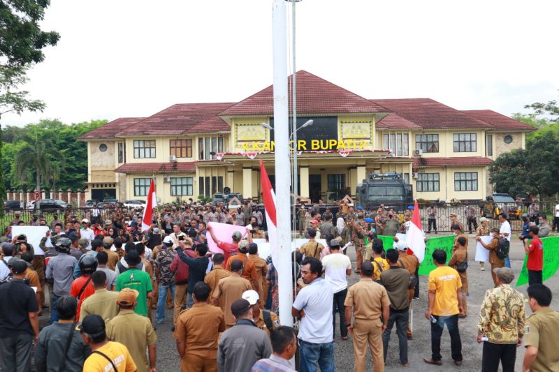 redaksiharian.com – Ratusan personel Polres Lampung Timur, Polda Lampung melakukan pengamanan unjuk rasa yang dilakukan perangkat desa di Kantor Bupati Lampung Timur dan gedung DPRD setempat, Senin.