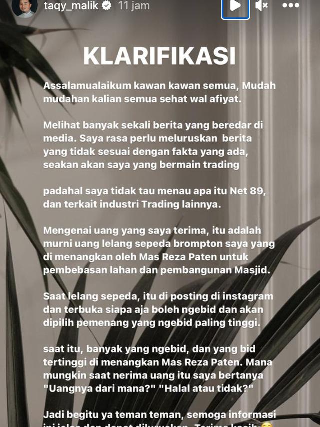 Taqy Malik kemudian menyampaikan klarifikasi tertulis lewat akun Instagram terverifikasinya pada hari yang sama. Dalam unggahan di Instagram Stories, ia mengaku tak tahu-menahu soal Net89.